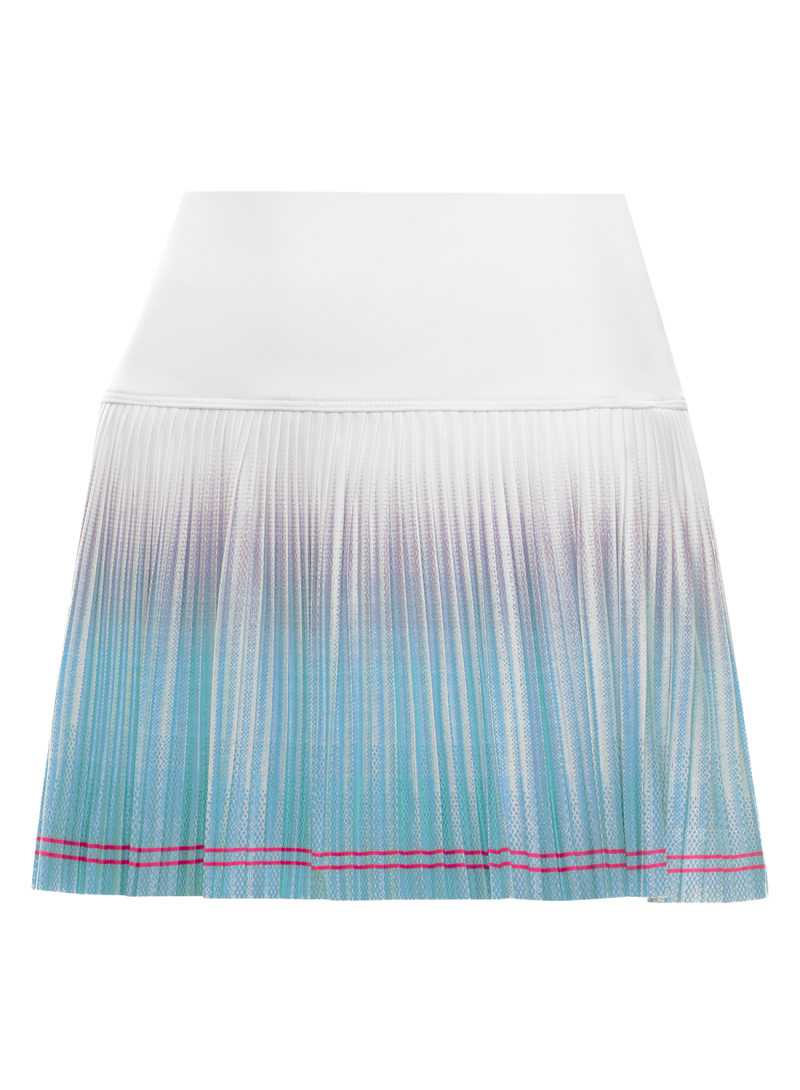 The classic pleated tennis skirt redefined with your performance in mind. This easy-fitting skirt is all about movement and ventilation with its lightweight fabric and pleating. The design features a sophisticated palette of White, Amethyst, and Angel that play out in a sun-setting ombre, printed across the lightweight pleats. It also has credit card pockets on the shorties and a trendy, higher waistline with compression along the waistband that allows for a forgiving fit.
