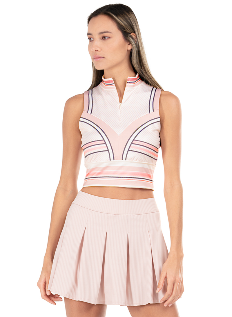 A crop top that will keep you at the top of your game. This banded compression bralette top will give you more support than your favorite doubles partner thanks to the high compression, moisture wicking, performance fabric. It also features a mock neck with an invisible zip and chevron cut-and-sow design lines that accentuate the abstract geometric pinstripe details.