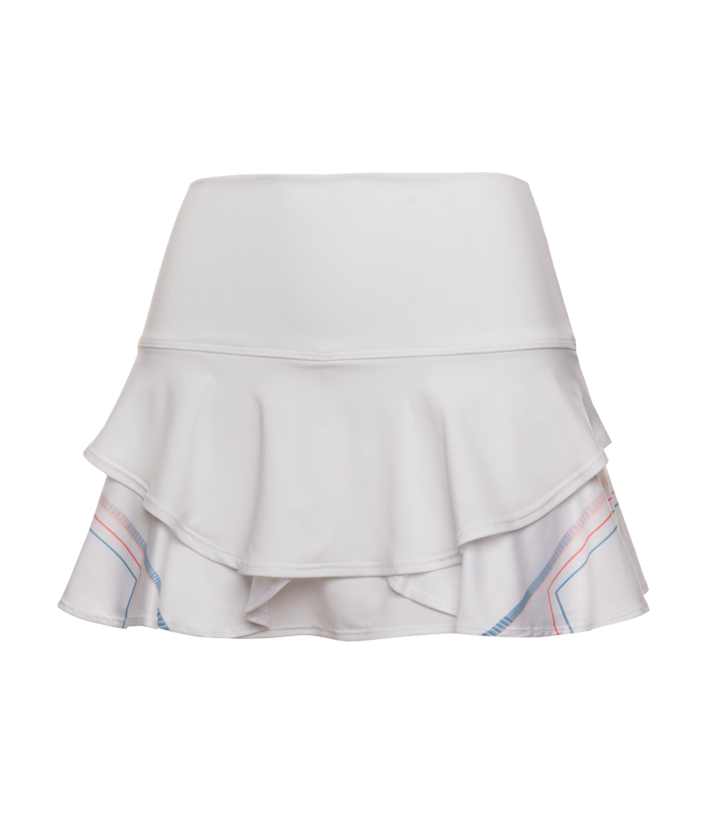 Vítejte v klasické bílé sukni nové generace. Tato vrstvená sukně s vysokým pasem má kompresní pas s přehozem, kompresní šortky a boční kapsy. Je navržena tak, aby se vznášela na vašem těle a přinesla spoustu pohybu a barevné akcenty díky šípovým úhlům a sportovním pruhům, které tančí a pohybují se jako paprsky zapadajícího slunce.