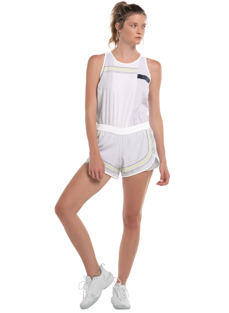 Dreng konkurrenterne i denne eksklusive, lette, strækbare vævede sparkedragt. Med en indbygget kompressionsshortie, tætsiddende talje og blouson-top, der er designet til at flyde på kroppen og give dig ekstra strækning på din serv. De moderne nålestriber og dristige geometriske designlinjer giver et moderne touch til et klassisk look.