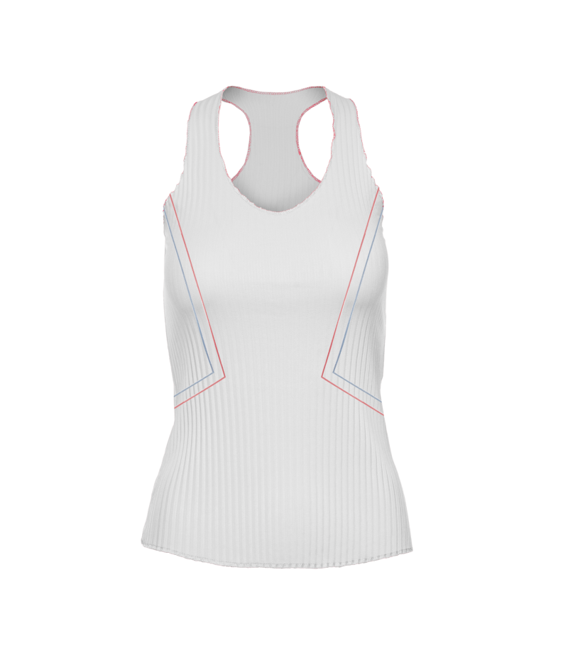 Innovaatio ja toiminnallisuus auttavat määrittelemään klassisen valkoisen tennispaidan uudelleen. Laskostettu ja erittäin kevyt kangas mahdollistavat liikkumisen helppouden ja erinomaisen ilmankierron. Vartalonmyötäinen istuvuus on uskomattoman imarteleva, ja järvensiniset ja simpukankuorenpinkit raidat lisäävät kulmikkaita värejä. Kangas on myös UPF 50+ -luokiteltu, mikä tarjoaa aurinkosuojan sekä kentällä että sen ulkopuolella.