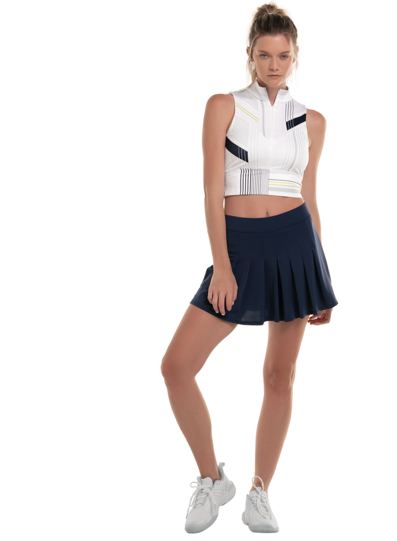 Ovaj elegantni, aerodinamični kompresijski top donosi svjež pristup klasičnom teniskom izgledu. Dizajniran je da prianja uz visoki struk, pružajući vam slobodu i pokrivenost kretanja, dok tkanina koja odvodi vlagu osigurava udobnost na terenu. Također ima ovratnik s patentnim zatvaračem i klasične žakard teksturirane prugice koje su redefinirane blokiranjem boja i detaljima zelene jabuke.